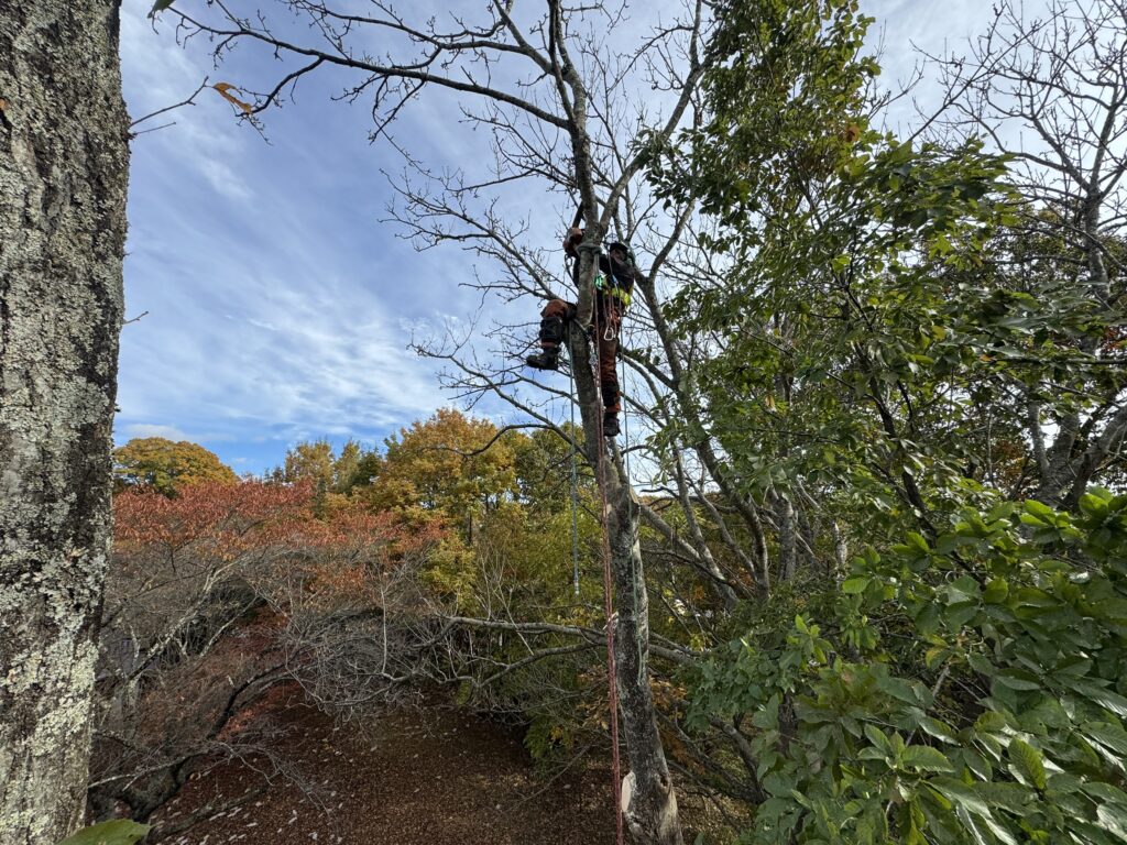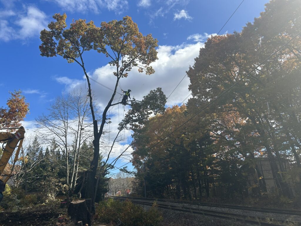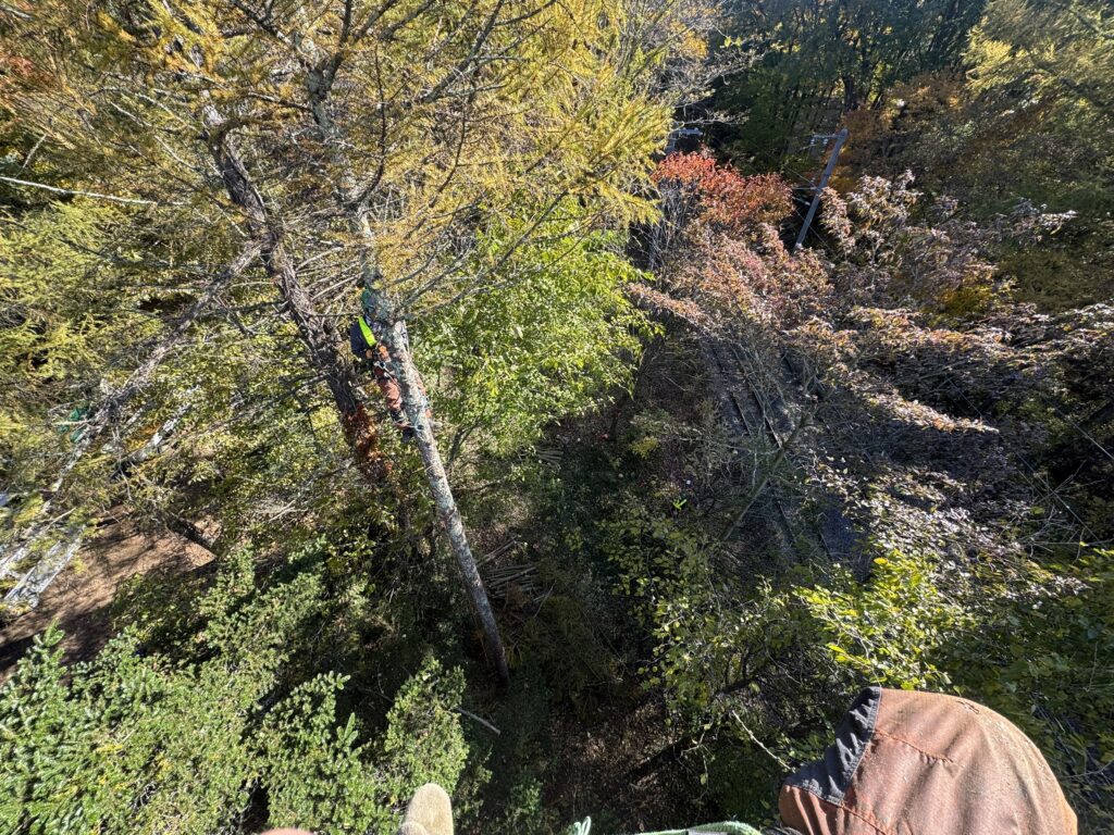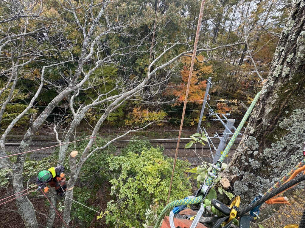 線路の送電線に掛かっている木がほとんどで、リギングによる吊り伐り、重機のウィンチによる牽引伐採、人力による牽引伐採が主となりました!