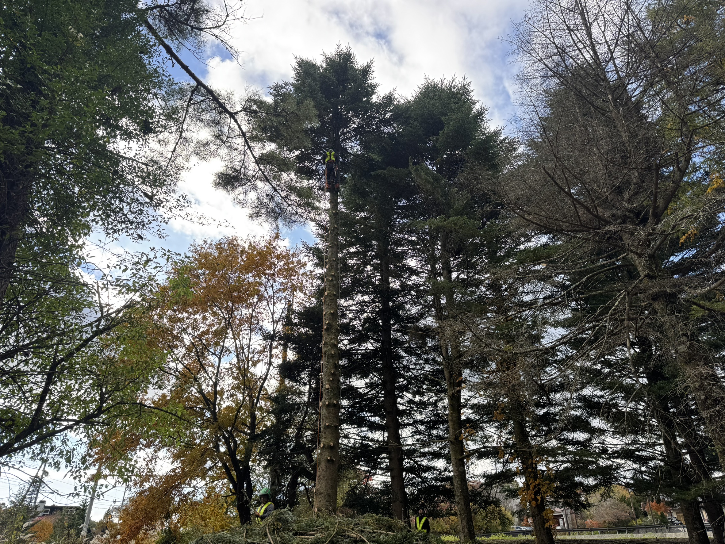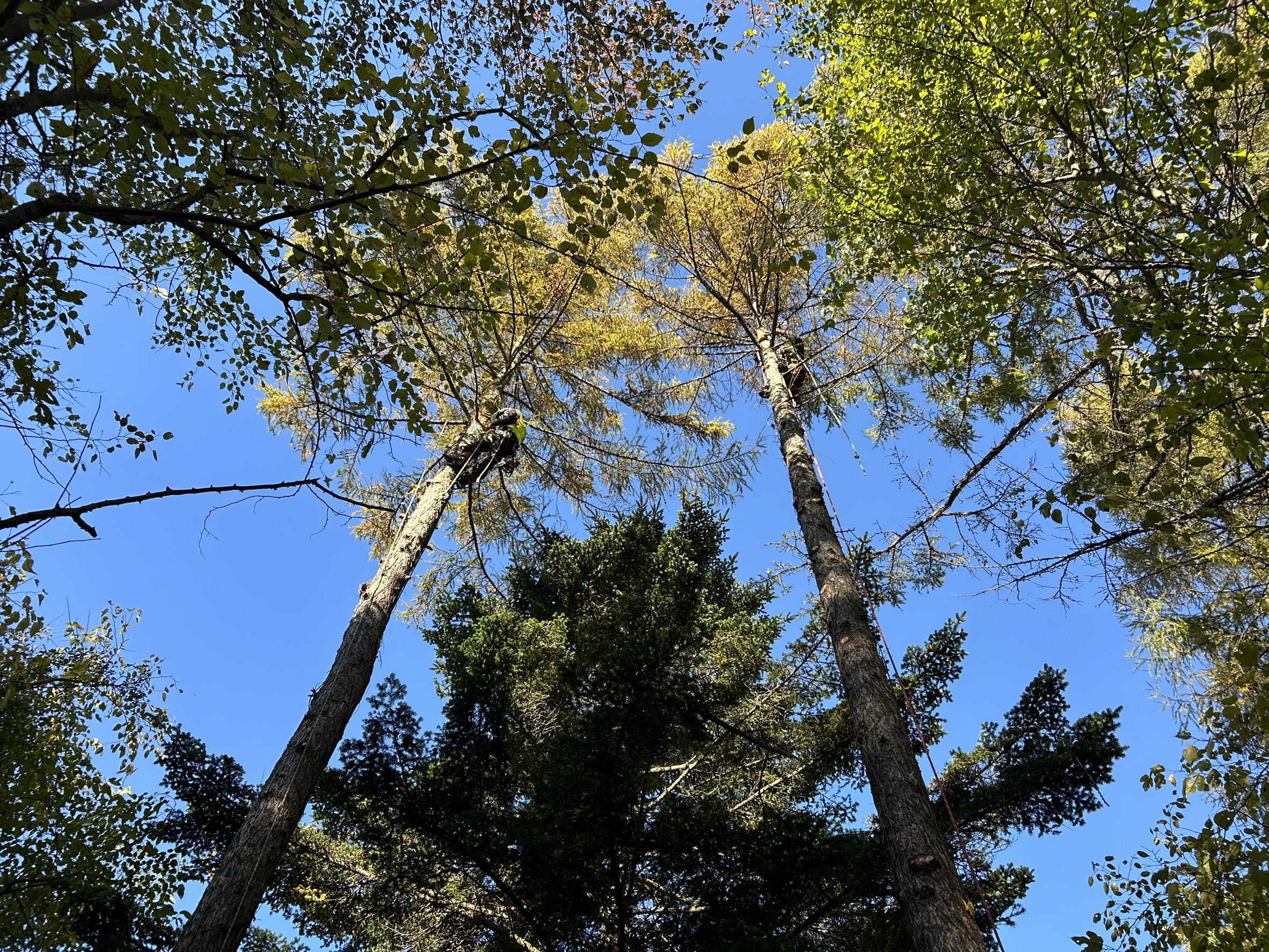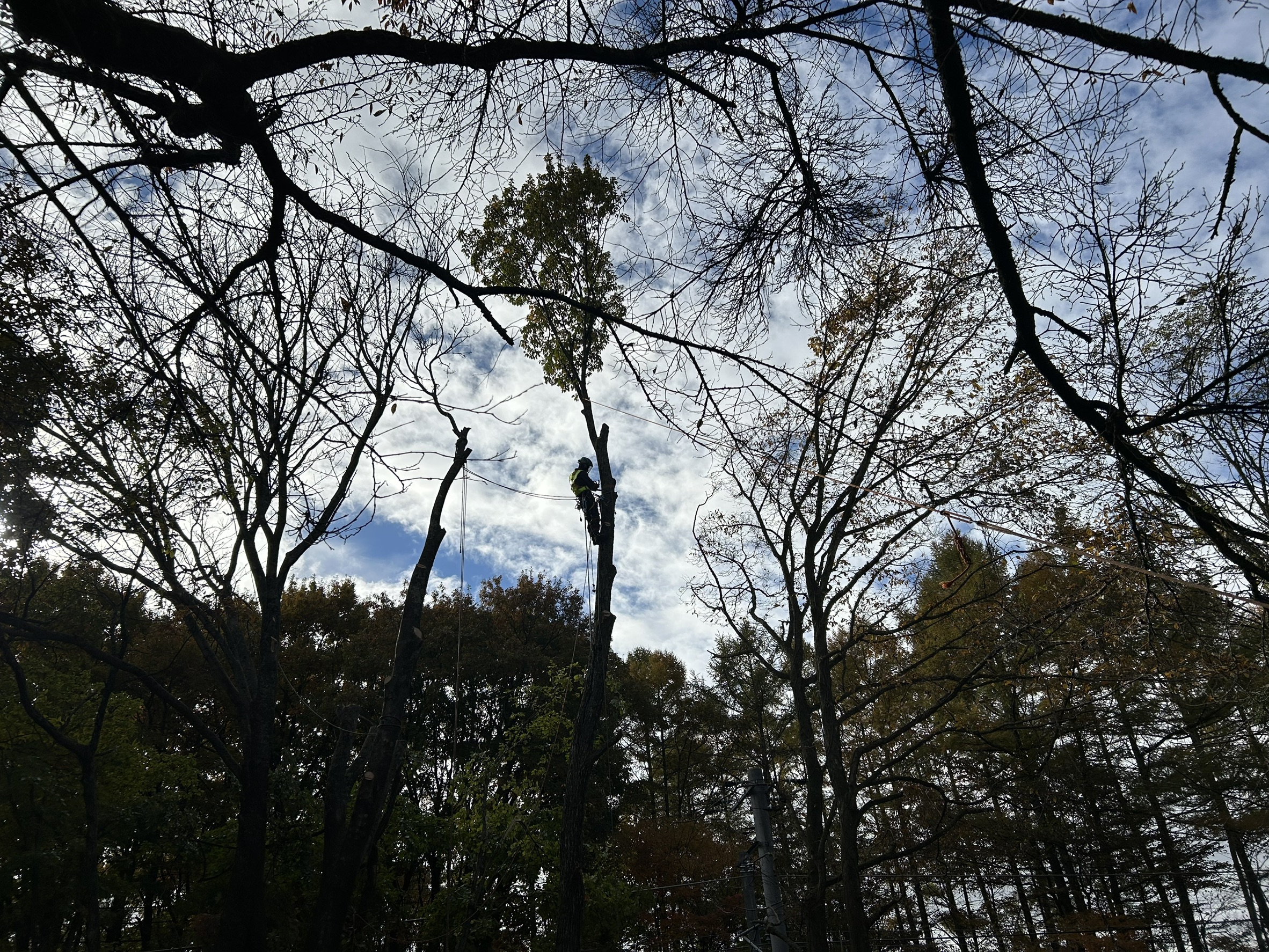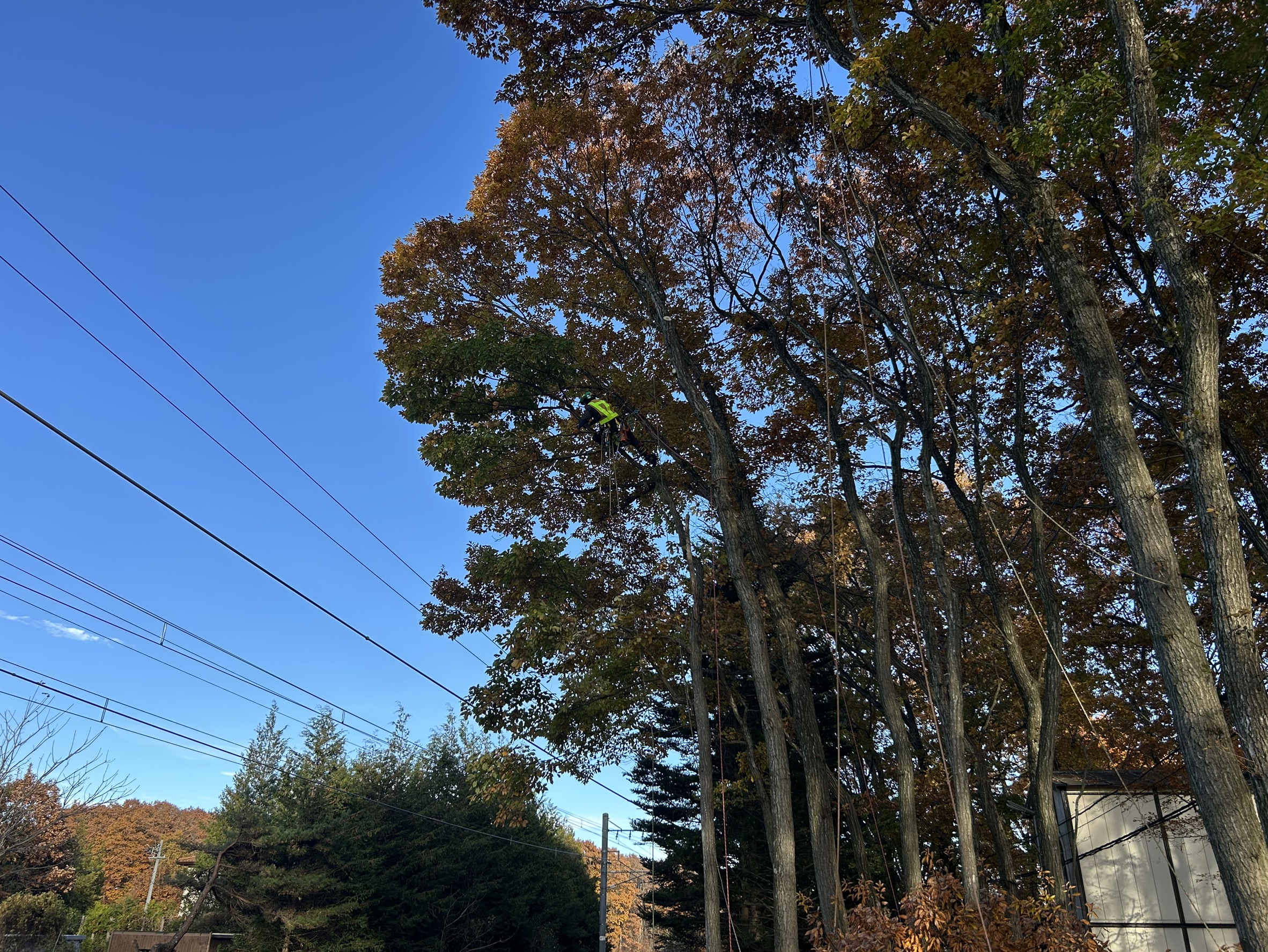 線路の送電線に掛かっている木がほとんどで、リギングによる吊り伐り、重機のウィンチによる牽引伐採、人力による牽引伐採が主となりました!